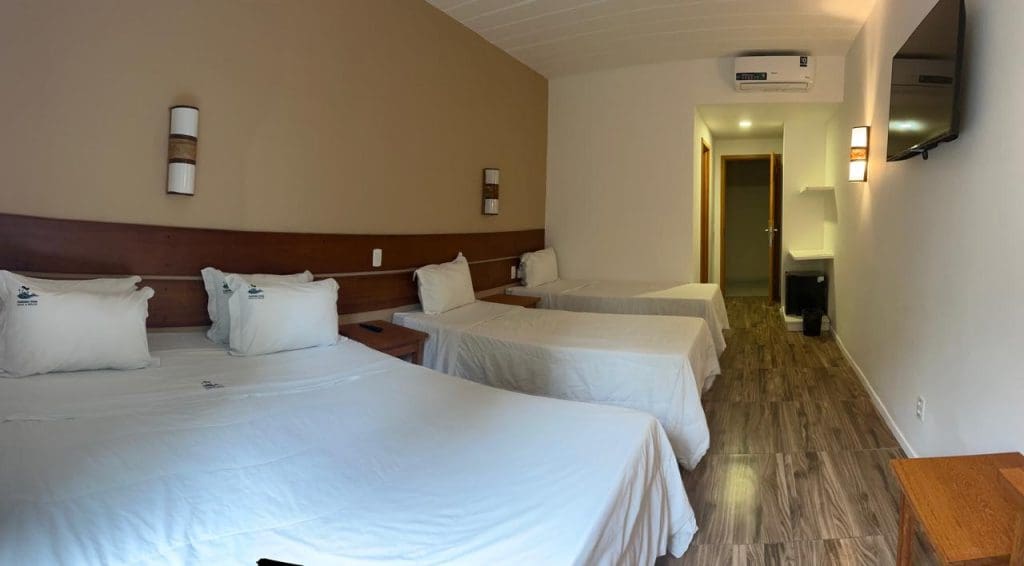 Equipado com ar-condicionado, TV Smart e frigobar, o quarto garante comodidade para relaxar após um dia de aventuras em Angra dos Reis. É o refúgio ideal para momentos de descanso com sua família, aliado ao ambiente acolhedor do Fradíssimo Hotel.